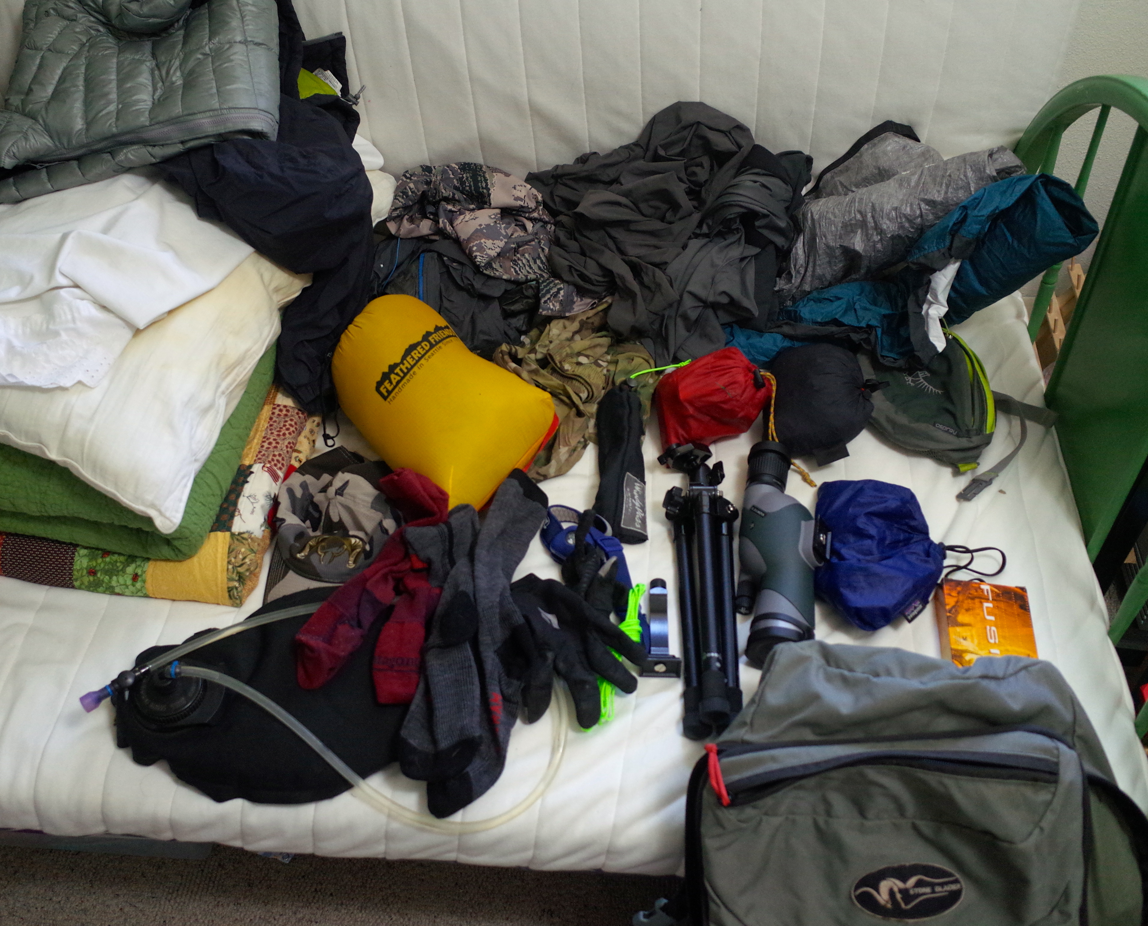 Sierras Designs Dridown Better vest and Rab Strata hoodie, which will probably be overkill, but glassing at 9000′ can be cold. Bringing both also allows a lighter sleeping bag.