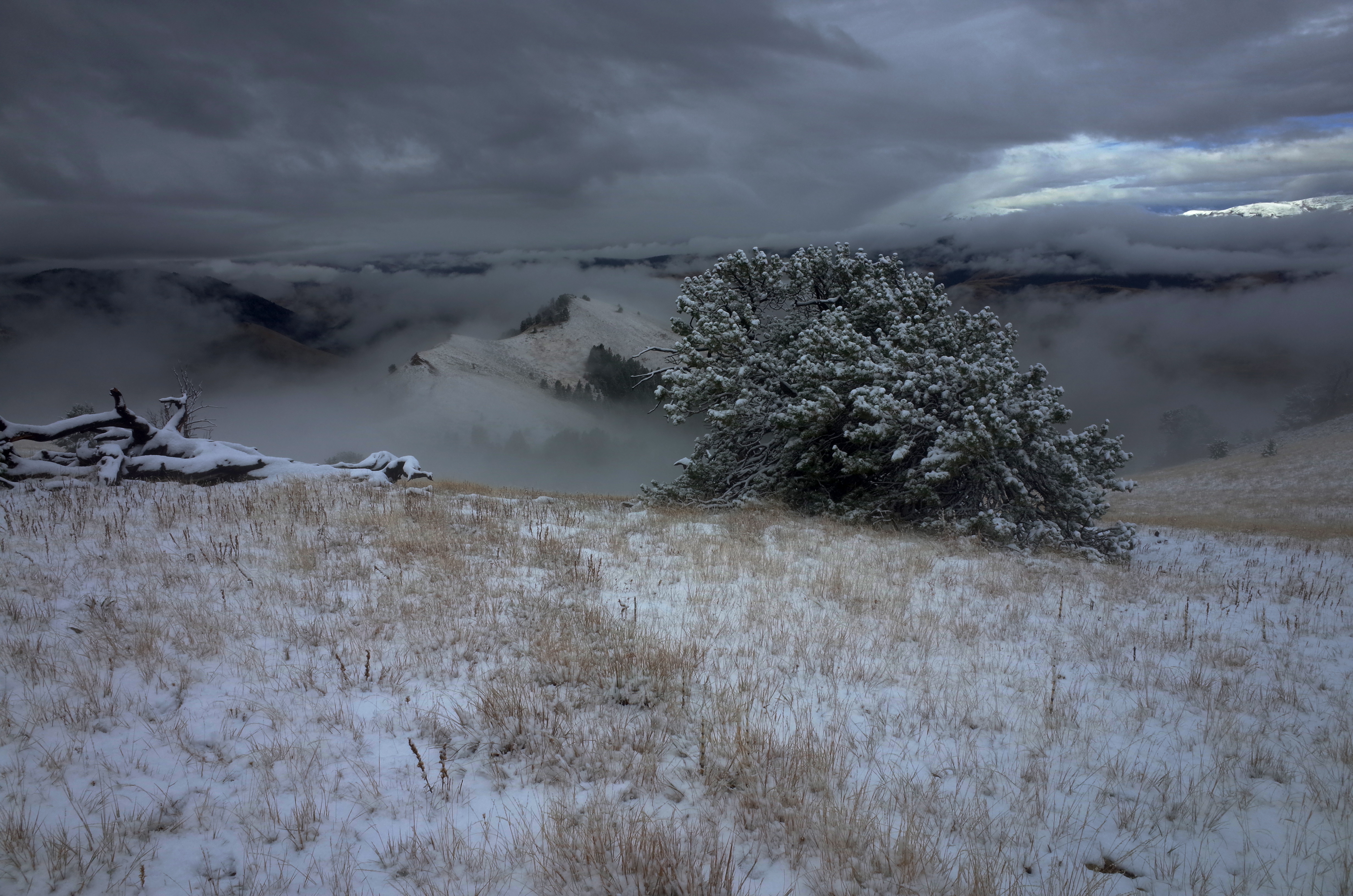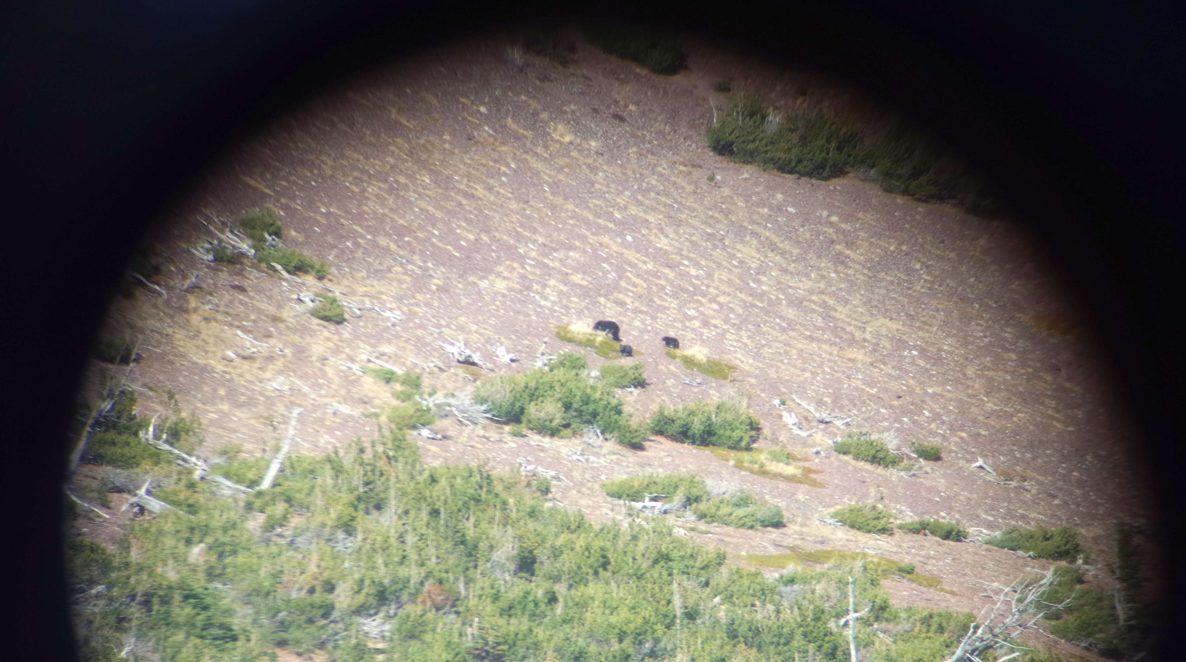 I was quite sick of hunting as I contoured back along the hill into the wind, intentionally taking the path of poor visibility to stay out of the 40 mph gusts which had deafened and almost knocked me over on the ridge above. Aside from a black sow grizzly and her two fat, sleek, dark cubs on the other side of the ridge I had seen nothing bigger than squirrels, hawks, and ravens all day. I had glassed multiple basins for hours, hiked across the tallest mountain in the Bob Marshall complex, and eeked enough water to keep me up there by melting snow inside my black hydration bladder. It was getting into late afternoon, prime hunting time and in a good location, and I was struggling against fatigue and repetition to pull my eyes and head into scanning every meadow when I saw the bear. Big, dark, and 30 yards uphill and upwind. It stared at me.