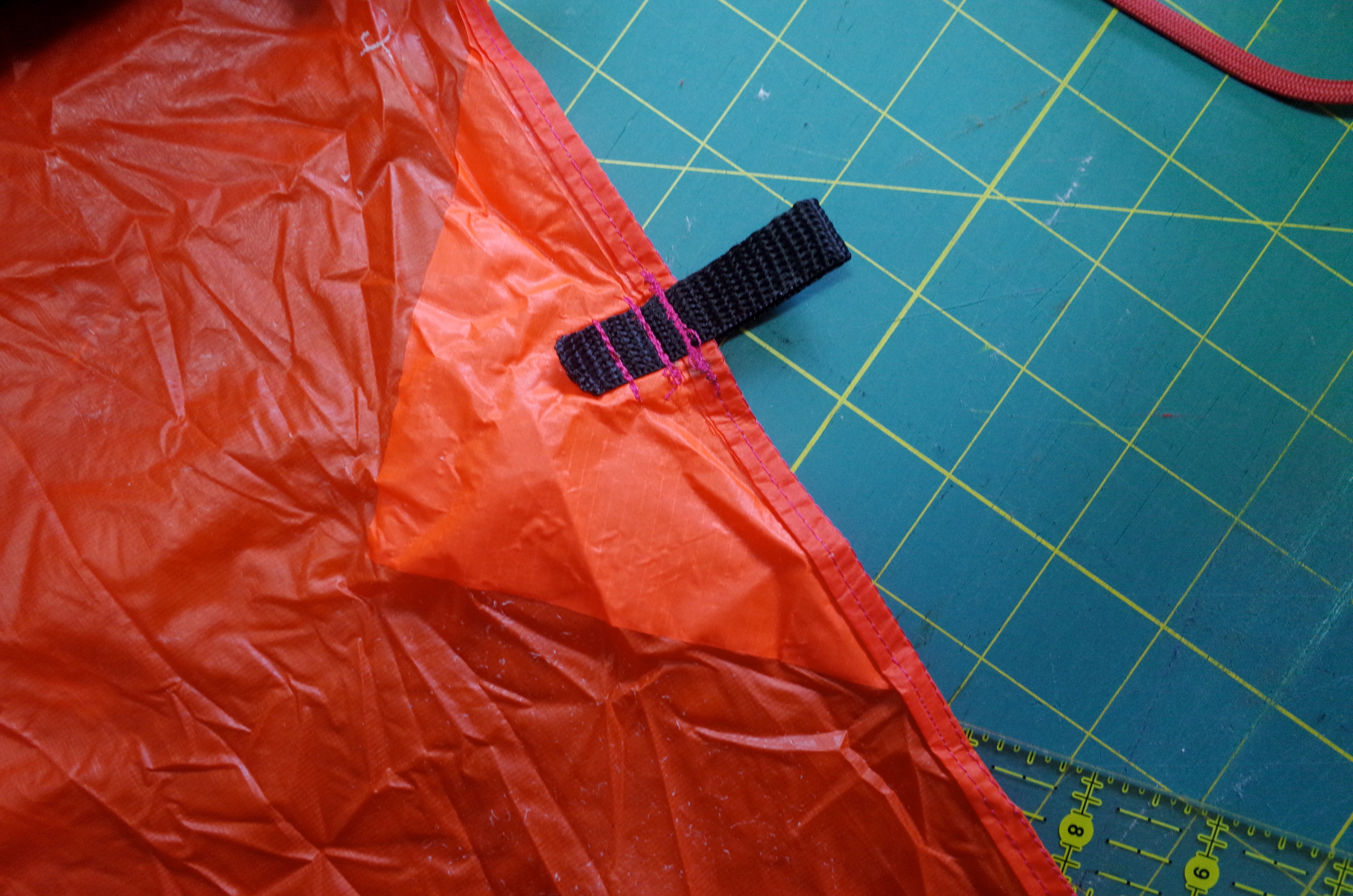 After the seams are finished, bartack on the webbing loops. I used 5/8″ polypro webbing, which is lighter and absorbs less water than nylon, and is more than strong enough. The tack on the seam is load bearing, and goes through six layer of fabric for strength. The secondary lines of stitching are for insurance purposes. I put linelocs on the corners for ease of use.