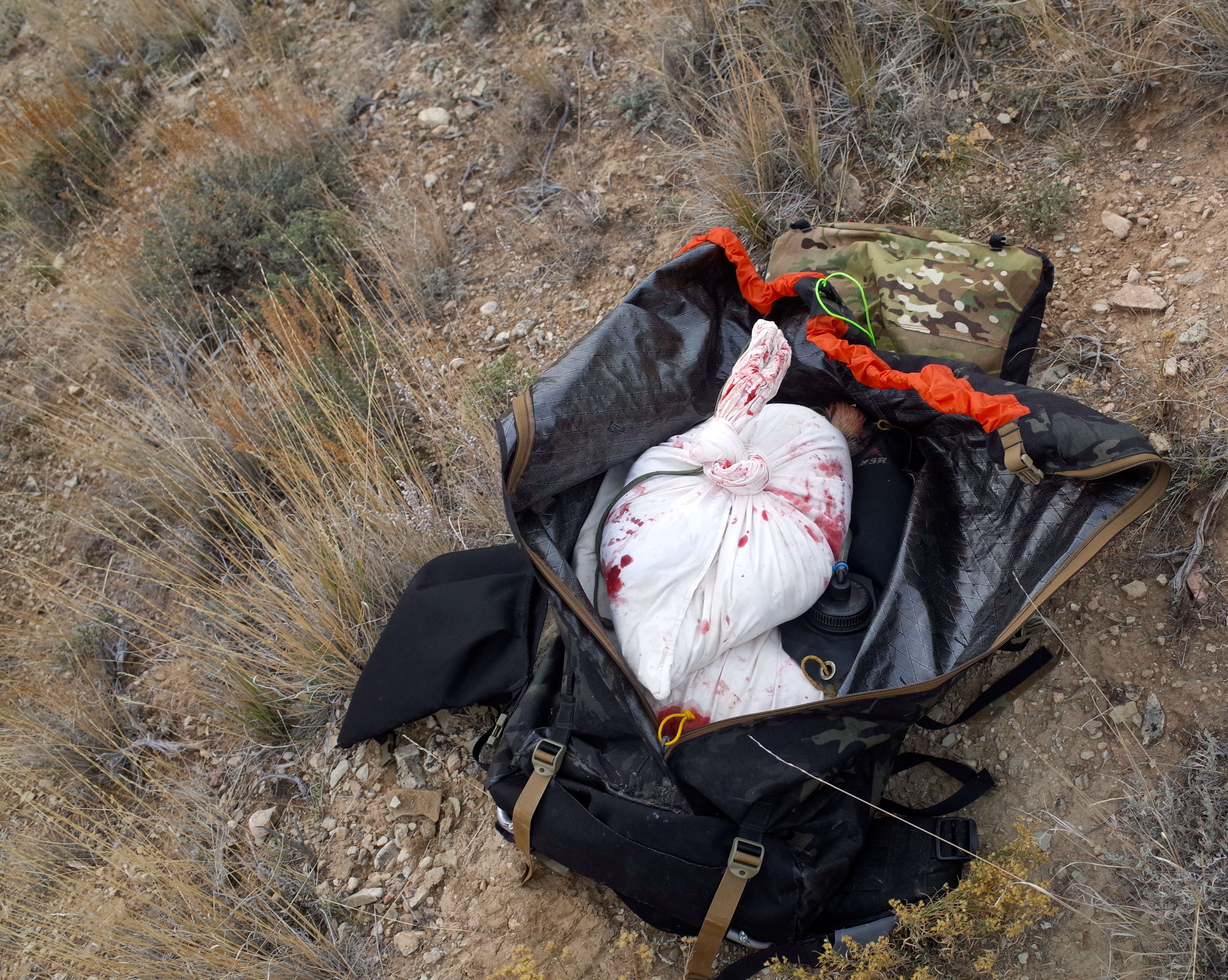 Collecting my pack and chambering another round, I headed down to where I had last seen the deer. Before I got there I saw abundant blood splashed over the dirt and rocks, every 3 to 5 feet. Then more blood, bright and thick, and then a dead deer crumpled in the short brush on a steep hillside. It had come to rest in an old animal bed, providing just enough purchase my both it and myself. I had left camp in the dark barely three hours before.
