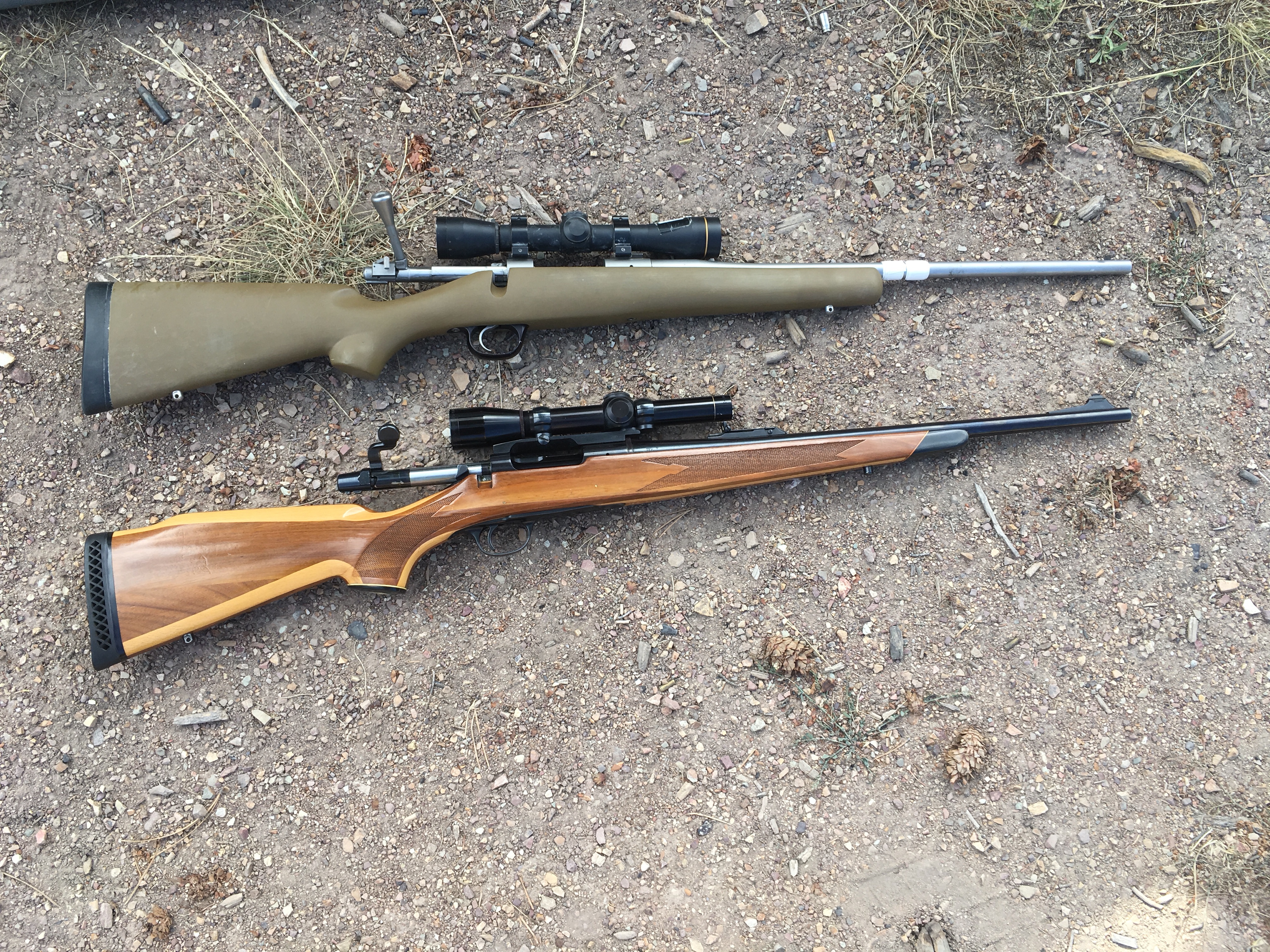 At top is my Kimber .308, which I’ve carried for hundreds of miles and with which I’ve shot over a dozen big game animals (and over a dozen grouse). It’s light, shoulders instantly, and I trust it totally. In the search for more consistent terminal performance and no concerns with lead in meat I’ve been using Barnes TSX bullets, 168 grain. The bottom rifle is my grandfathers, on long-term loan from my cousin, a Remington 660 in .350 rem mag. The 660 is a bit heavier, kicks more, and holds fewer rounds in the magazine, but otherwise the guns feel similar, close to identical. The older 3x M8 on the 660 is even darn close to the FX 4x I’ve had on the Kimber since the beginning.