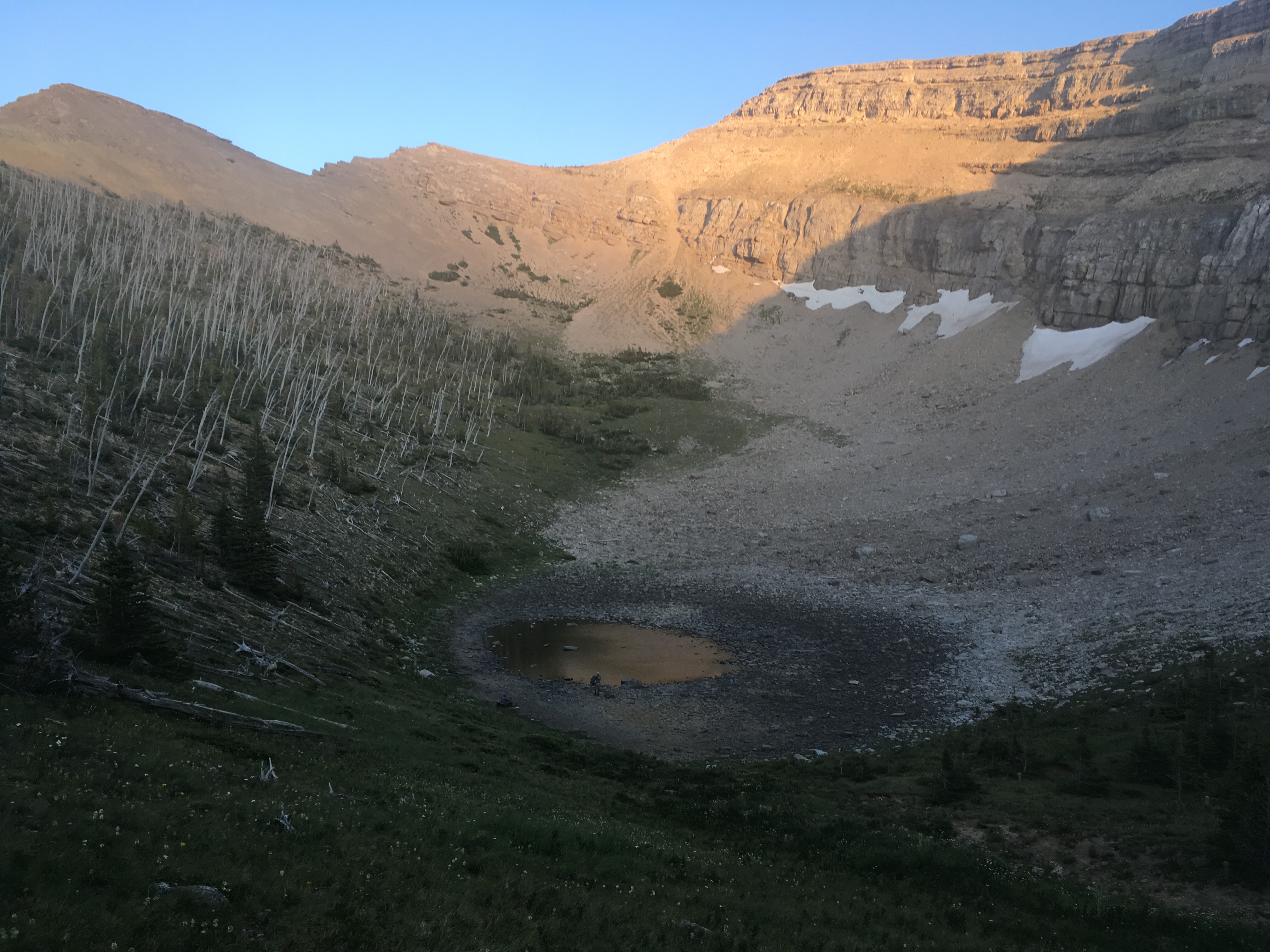 The tarn shown below defies all expectation. The cliff out of sight and on the left drops over a thousand feet to the tundra below. The pass behind me, where we camped that night, is 300 feet above the water. This photo was taken in early August on a year with a late spring, which means that at 8000′ the almost immeasurable snow which must have accumulated had perhaps six weeks prior to this to be liquid. The clear, grey high water mark was 6 vertical feet above the present level, which would seem to mean that, had we arrived a month later, we might have found no water at all. Which at the end of a long day, and a 20 minute coda of unexpected beargrass sidehilling, would have been inconvenient.