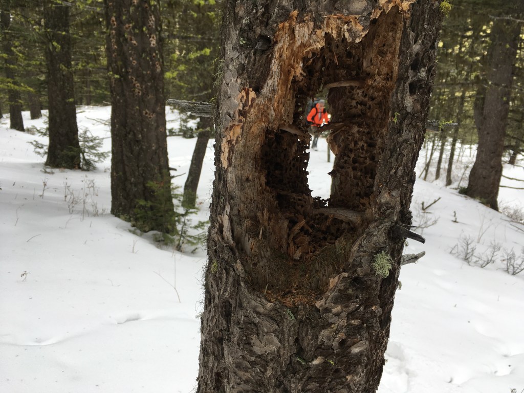 We also got to experience the extraordinary things you only see out walking in winter: melt patterns and degrees of windcrust changing aspect to aspect, old growth fir bedangled with moss standing stark above sculpted powder, the lives of animals laid bare in their tracks, vole to hare to deer to moose. We marveled at mule deer electing to stay high, seemingly with the intention of spending the winter on one sub-knoll, in an island of deep, with just enough immature willows. We spooked a grouse, who flew just far enough and alighted just so, bringing our eyes to the bulls bedded across the canyon.