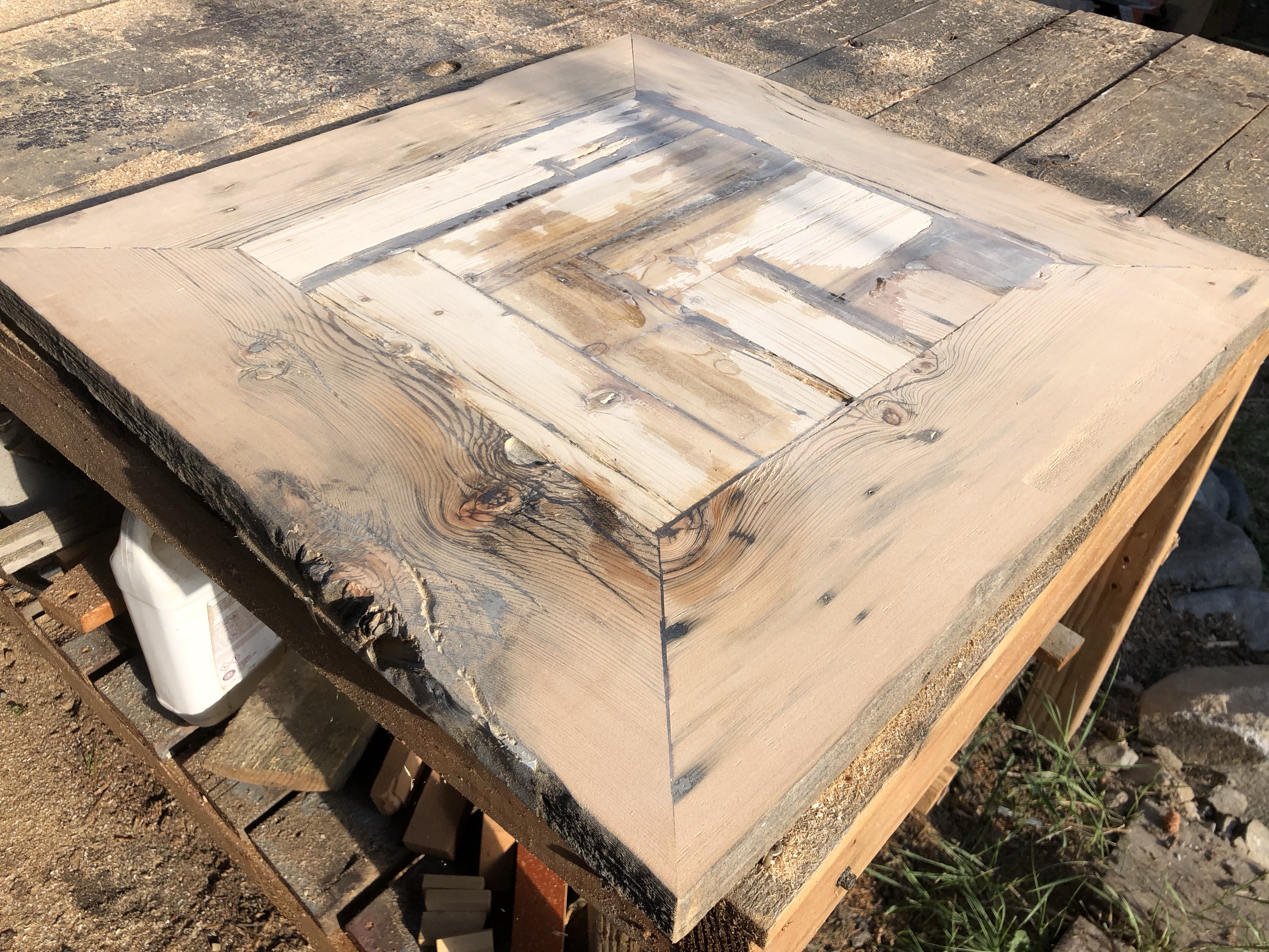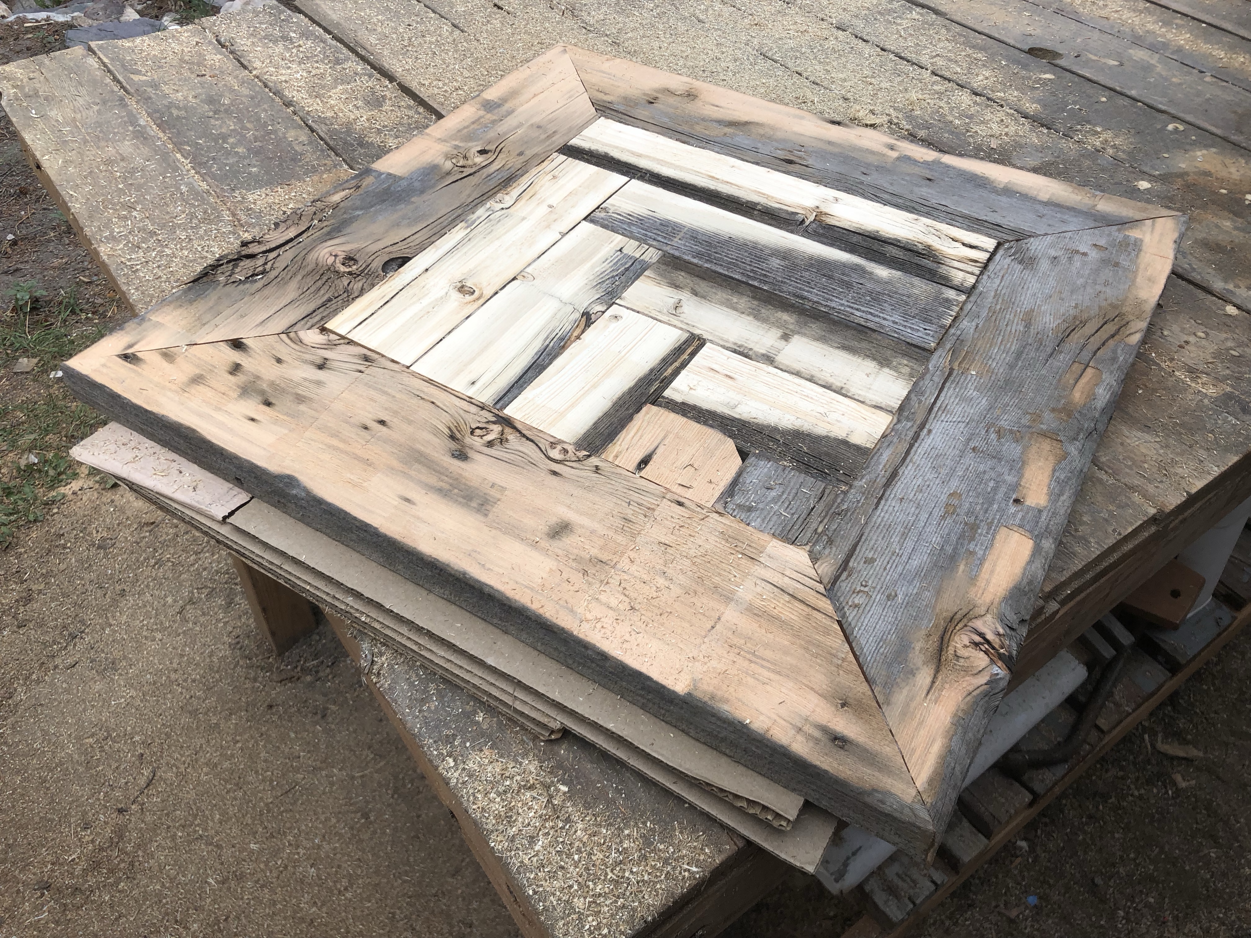 The desk starting with “reclaimed” wood salvaged from a pile in the woods. This lumber is of historical and nostalgic significance to me and probably a very few others, and likely thanks to being frozen much of the year, was in pretty good shape for being on the ground for so long. With the idea being a roughly 2 foot square top, I mitered a wider board into a square, screwed and glued this together, and infilled with smaller boards, gluing as I went.