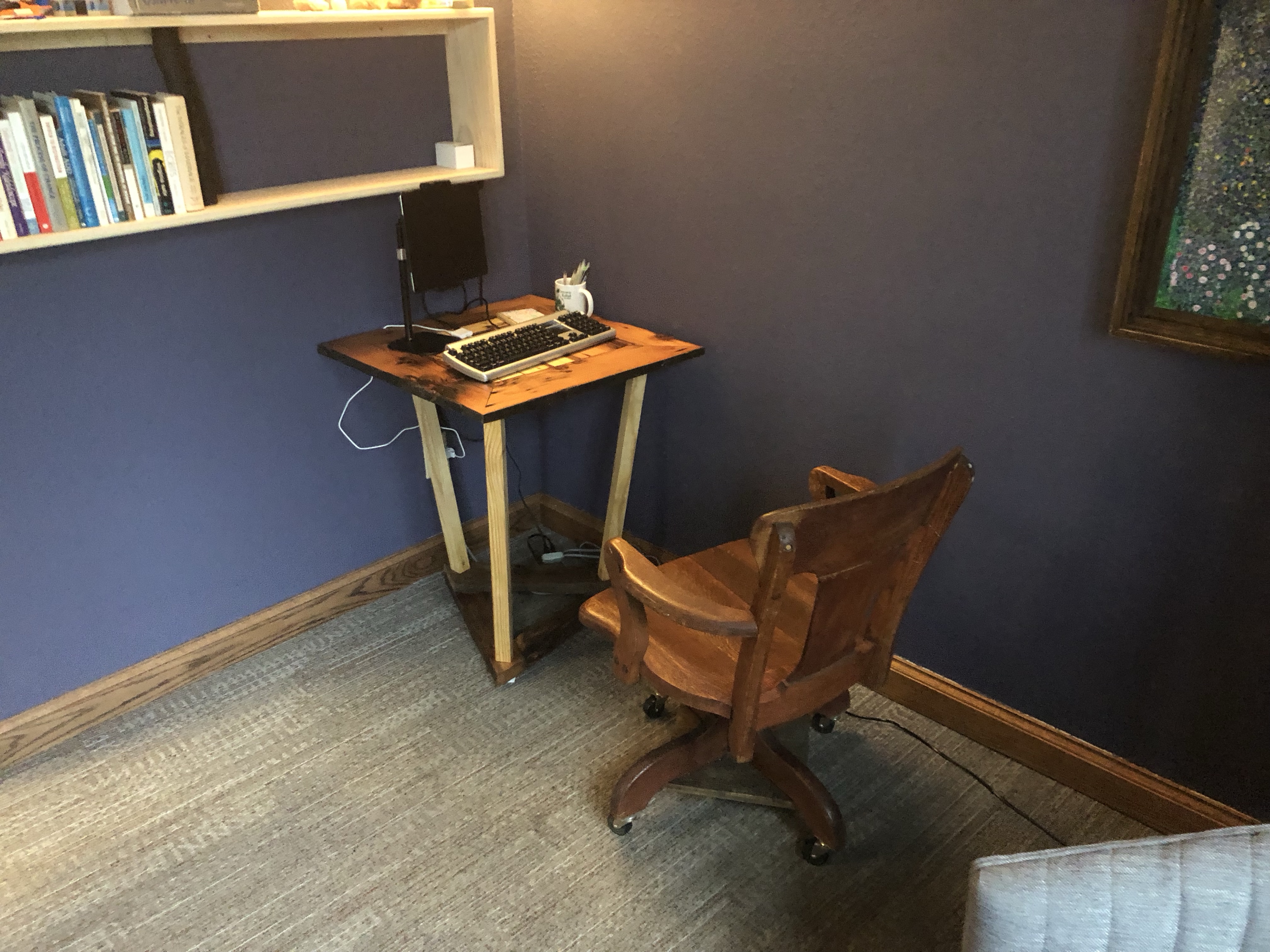 I moved to a new job last year, which provided a number of reasons to not write here. It also provided a reason to need a new desk, one being the small corner of my new office into which a desk best fit. Being a psychotherapist now, typing or anything-ing at a desk only occupies a few hours a week, and with a smallish office the literal and visual footprint of the desk could be modest. That and woodworking has become a major interest of late, making this a great excuse for a furniture project.