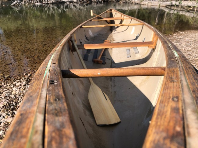 Once we got back and things got settled towards the end of the school year, I started chipping away at the Revelation. All the wood came off, and the bare hull got thoroughly scrubbed. A few of the cold cracks had been “fixed” with some manner of caulk, which was not fun to remove. Eventually the business got rolling, with a multi, multi stage process of taking the underside of the cracks (with Tyvek tape), filling them, letting the epoxy set, then flipping the boat and repeating. Due to the curved hull just one cycle here took four seperate steps and the better part of a week. I laminated 6oz glass to the insides of the larger cracks, and then added a layer of innegra after that single layer of glass failed the mallet test (I could whack the outside reasonably hard and start to delam along the crack). The gunnells required many coats of oil, but came back to life beautifully, and the stock cane seats were a total loss that I replaced with solid wood benches. This whole deal was tedious, but not enormously time consuming in hours (just days), and has resulted in a repair that held up fine to a whole lot of shallow water and dragging over logjams this past summer and fall.