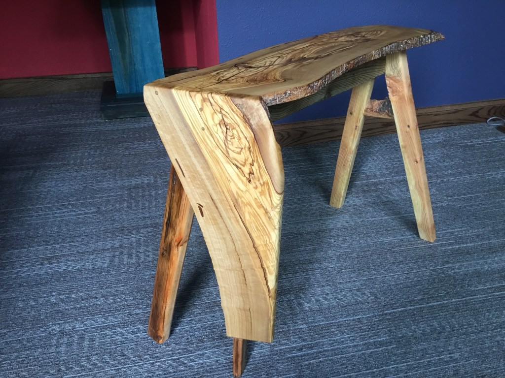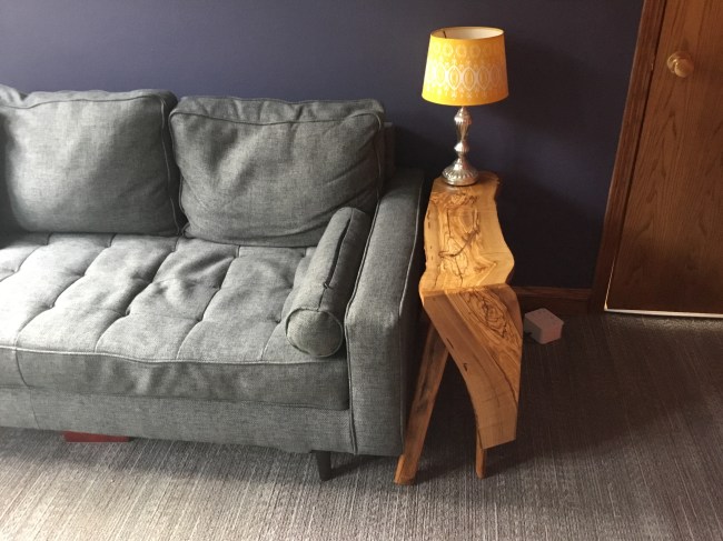 Being a therapist I need a couch, and that couch needs a place for the lamp and folks’ coffee. The olive was a treat to myself earlier this year, as the 5ish foot length (of the most figured and funky stuff they had) cost a cool 70 bucks, which before I got into the intricacies of wood and making stuff to show that off, would have seemed beyond outrageous.