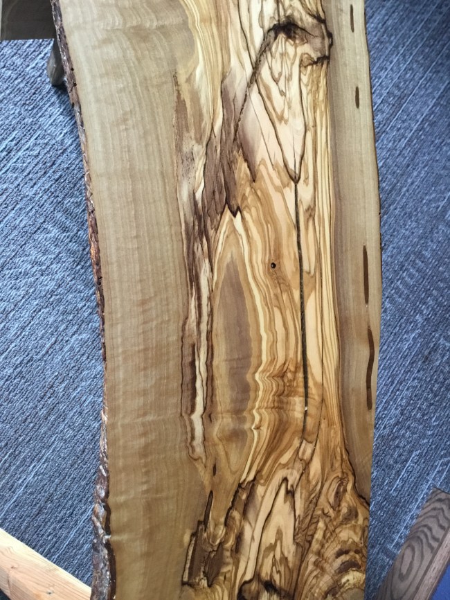 I filled the various cracks and gaps with clear epoxy, made an angled cut with a gentle miter, flipped the short piece (to highlight the different yet same grain structure), and attached with plain old screws, whose holes were filled with epoxy mixed with wood dust (from initial sanding of the olive). Not as sophisticated as a classic river table, but I am not yet that skilled, and into not hiding the bits that go into making wood into a thing. The epoxy curing in a few of the larger cracks caused a good inch of warp over the first night, which I’d never before seen, and required more aggression than planned to fix, hence the chunky salvaged pine 2 by 4 glued to the base, which looks fine (I think) and flatened things out nicely. Live edge cleanup I did with a wire brush, good enough to get things clean without impacting the natural appearance at all. And leaves no marks upon finishing.