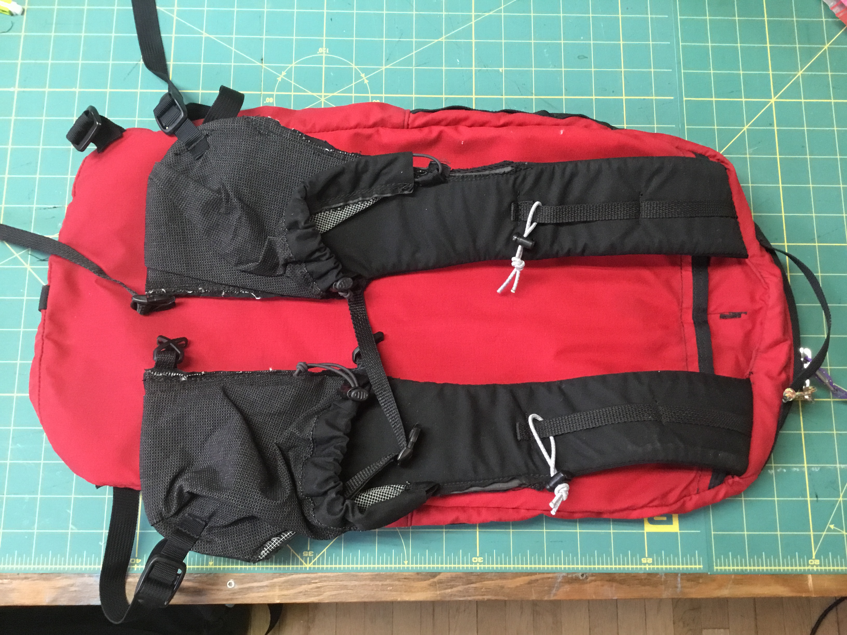 Apart from the shape the list of features is short. There is a clamshell zip which is on my pack a good bit shorter than on the stock model. There is a center daisy on the front panel, and a side daisy which follows the wrap of the zipper. There is an “energy bar” pocket, which is an open topped mesh sleeve sewn into the top of the divider flap, and just the right size for 2 regular Snickers. The Stealth has a full width, almost full length external sleeve on the backpanel, with a velcro strip closure. This is advertised for a hydration bladder, while I’ve only used it for a 1/8″, flexible foam sheet, which adds just a bit of structure without taking away any of the hug which makes the thing bag ride so well. The stock shoulder straps were fine, if a bit thin and short for heavier loads. My only real objection was the lack of any external, on-the-fly pocketing. An understandable ommision, given the design remit, but one that for hiking and ski touring a found a serious problem. So I made new shoulder straps, with vest style front pocketing and dual strenum straps. The pockets are big enough to hold a 16oz nalgene securely (it will stay in during a mild tomahawk skiing), and the dual sternum straps have been more welcome than I thought during things like tree skiing, and even make the Stealth into a workable running pack (caveat, not my area of expertise). In an ideal world the Stealth would have some sort of top pocket to keep keys, headlamp, etc separate, but due to the divider making that happen would be reasonably complex, and its absence is something I can work around.